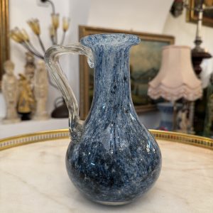 Deosebita carafă din sticlă suflată manual, cu model marmorat în nuanțe de albastru, bleumarin și gri, cu efect fluid, elegant. Forma este rotunjită, cu gât înalt și deschidere evazată, iar mânerul este din sticlă transparentă, curbată artistic.