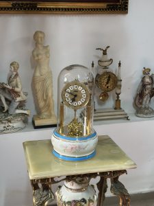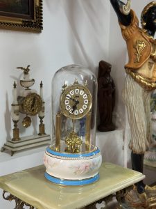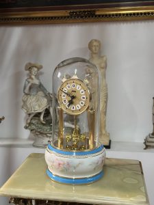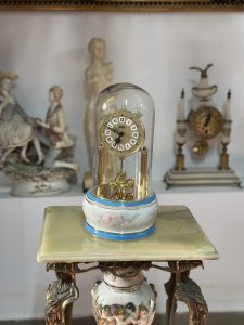 Ceas sub cupola din sticlă pe suport din porțelan fin