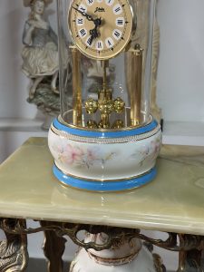 Ceas elegant, tip anniversary clock, protejat de o cupolă din sticlă groasă și așezat pe un suport din porțelan fin, decorat manual cu flori pastel.