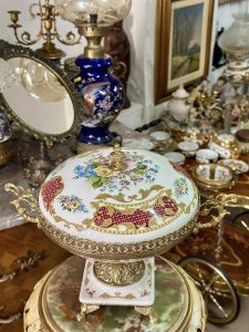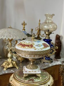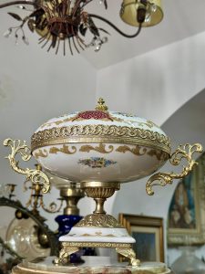 Piesă decorativă elegantă realizată din porțelan ALFA – Italia, fin decorat cu motive florale policrome și ornamente aurii. Capacul bombat este bogat ornamentat și prevăzut cu buton decorativ, iar corpul este încadrat de o montură rafinată din bronz aurit cu mânere laterale sculptate