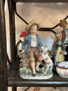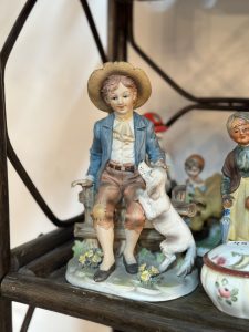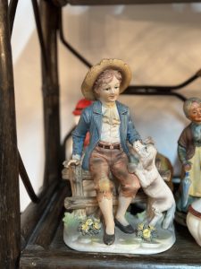 Figurină realizată din porțelan biscuit, reprezentând un băiat îmbrăcat în stil rustic, așezat pe o băncuță de lemn, alături de câinele său