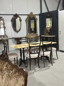 Set de dining deosebit, realizat manual în Italia, în jurul anilor 1950, din lemn masiv, cu detalii clasice și proporții elegante. Piesele sunt solide, bine lucrate, potrivite atât pentru un interior clasic, cât și pentru un decor eclectic cu accent vintage.