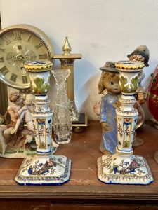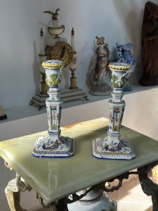 Pereche sfeșnice antice franceze, cca. 1900 – ceramică pictată manual, stil Rouen, semnate, piese rare