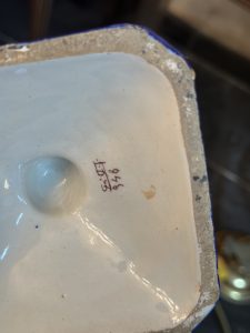 Culorile sunt autentice vremii: albastru cobalt, verde, roșu cărămiziu și auriu stilizat. Pe partea inferioară se regăsește un număr de atelier / marcaj pictat, caracteristic pieselor vechi făcute manual