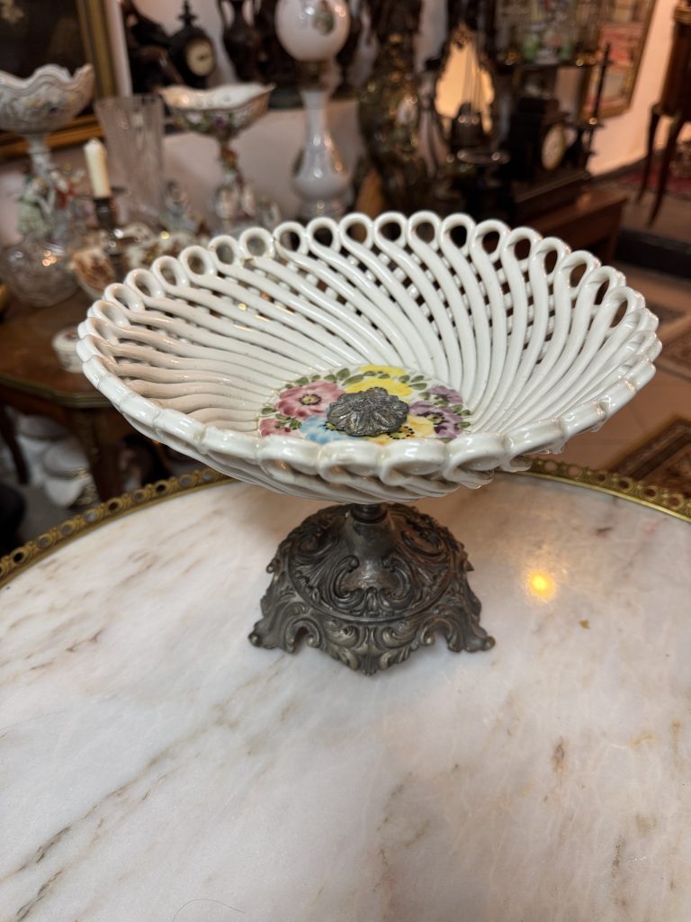 Fructieră / bombonieră vintage din porțelan cu picior metalic Piesă decorativă elegantă, compusă dintr-o cupă…