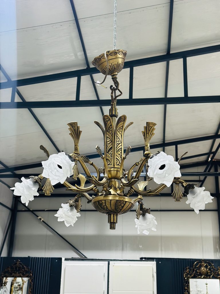 Candelabru vintage din alamă masivă, prevăzut cu cinci brațe curbate, fiecare decorat cu abajururi din…