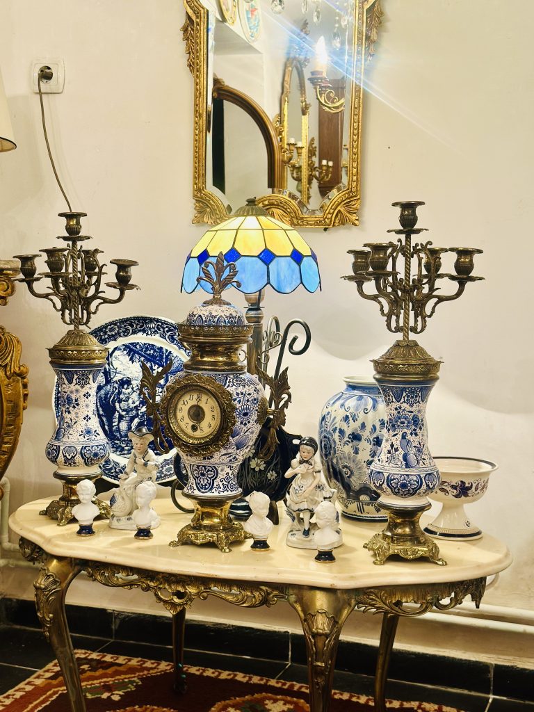 Set decorativ impresionat-ceas cu două sfeșnice din bronz cu porțelan Delfts