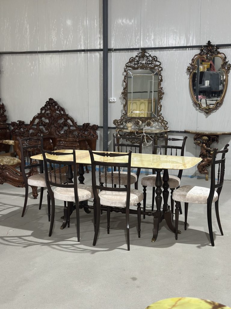 Masa cu blat din marmură și șase scaune-lemn realizate manual