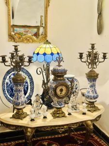 ✨ Set decorativ impresionant, format dintr-un ceas de masă mecanic – perfect funcțional, alături de două sfeșnice masive, realizate din bronz patinat și porțelan pictat manual Delfts, renumit pentru nuanțele sale alb–cobalt
