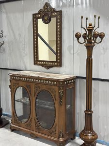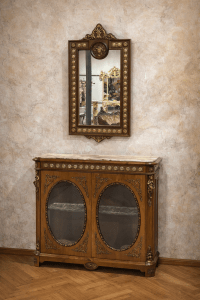 🔸 Întreaga piesă este completată de numeroase detalii sculptate, elemente florale, rozete și aplicații din bronz, care evidențiază măiestria execuției.