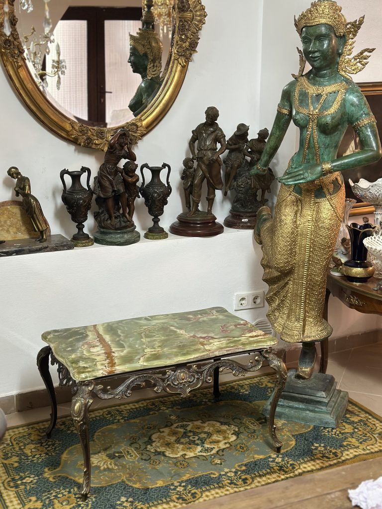 🔸 Pe colțuri se regăsesc statuete din bronz fin lucrate, reprezentând figuri clasice decorative, care oferă piesei un aer aristocratic.