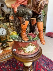 Statuetă din porțelan, de dimensiuni mari, reprezentând un tânăr vânător alături de câinele său. Realizată în stil clasic, cu finisaje atent lucrate și detalii expresive, această piesă este ideală pentru decoruri elegante sau colecții de porțelan