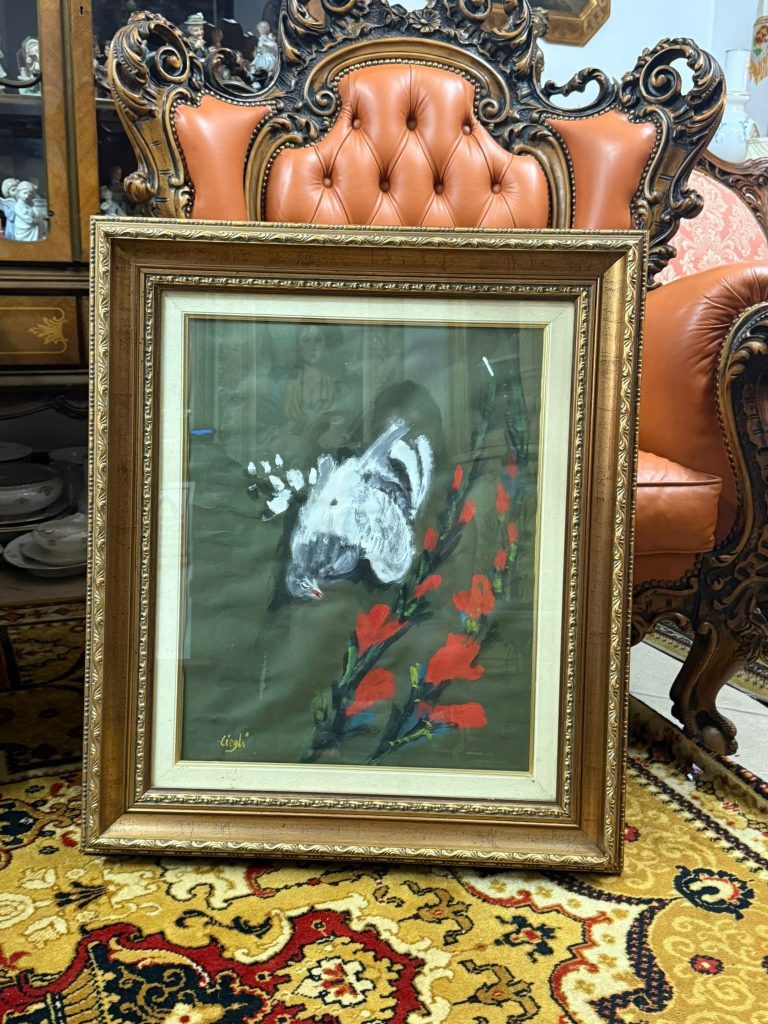 🕊️Tablou semnat – Porumbel alb și flori roșii – pictură pe pânză, cu sticlă și…