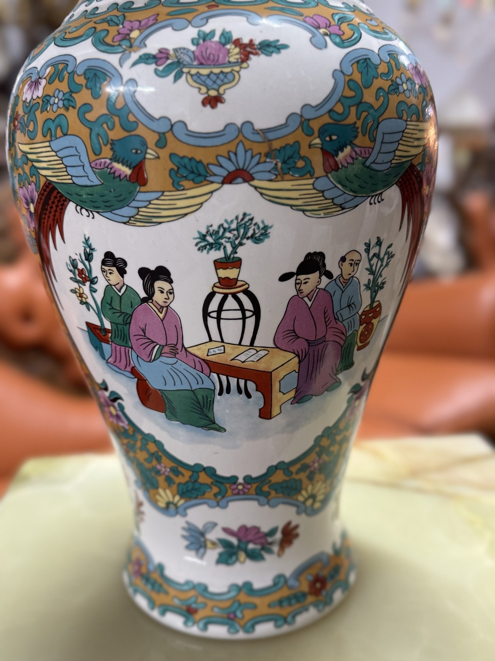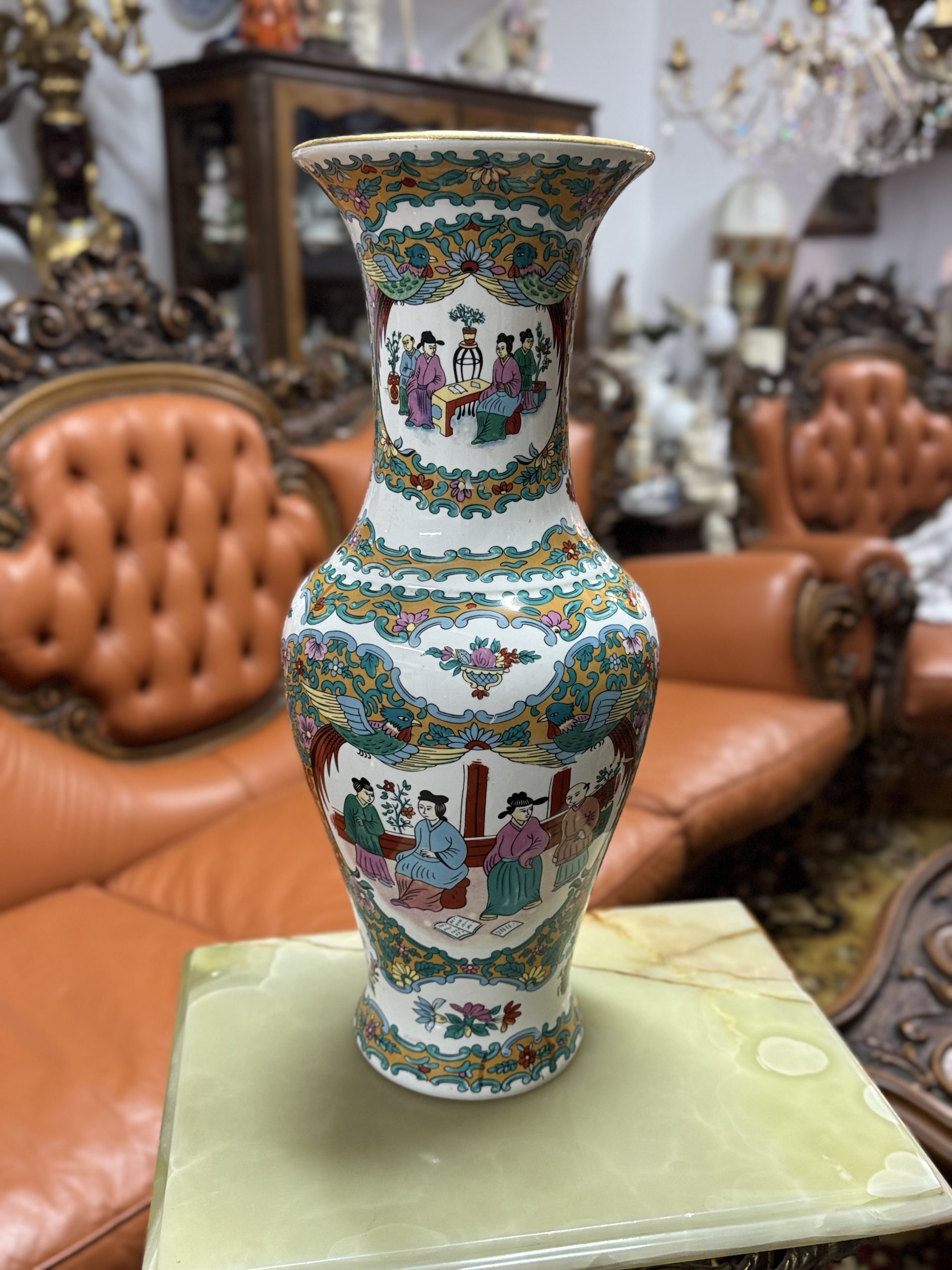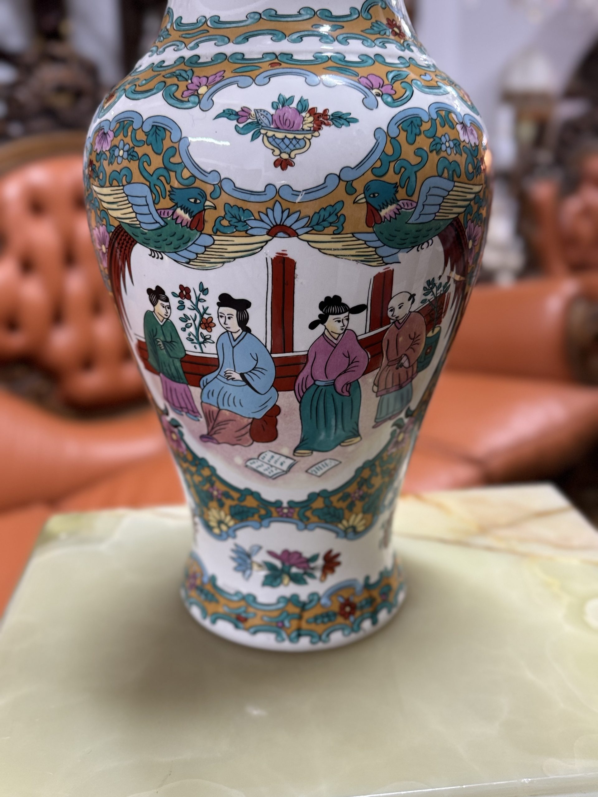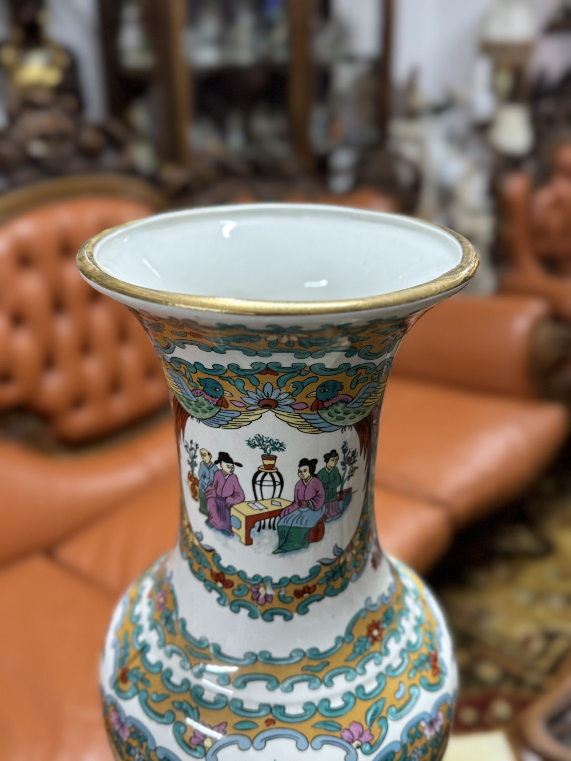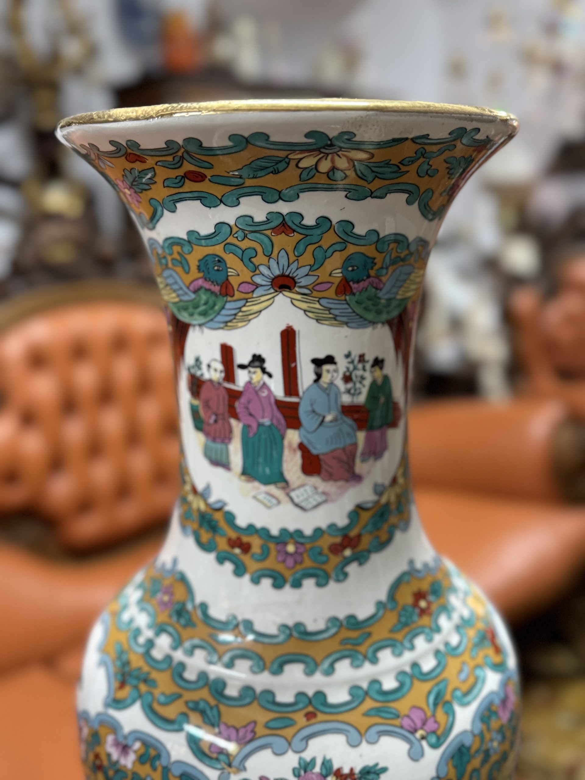 Această vază elegantă din porțelan este decorată manual cu scene tradiționale asiatice și motive florale bogat colorate. Designul său unic, cu gât evazat și corp în formă clasică, adaugă un plus de rafinament și exotism oricărui spațiu.